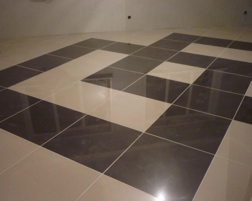 - При напольном монтаже клеевой состав тоже наносится по «двойному» принципу, но с другой пропорцией: толще – на основание, и тоньше – на плиты. При этом зубчатый шпатель движется не продольно, а под углом в 46-60 градусов. Чем больше размеры плиты, тем более глубокими должны быть «борозды». После этого плита укладывается на основание: с обязательным соблюдением деформационных швов.